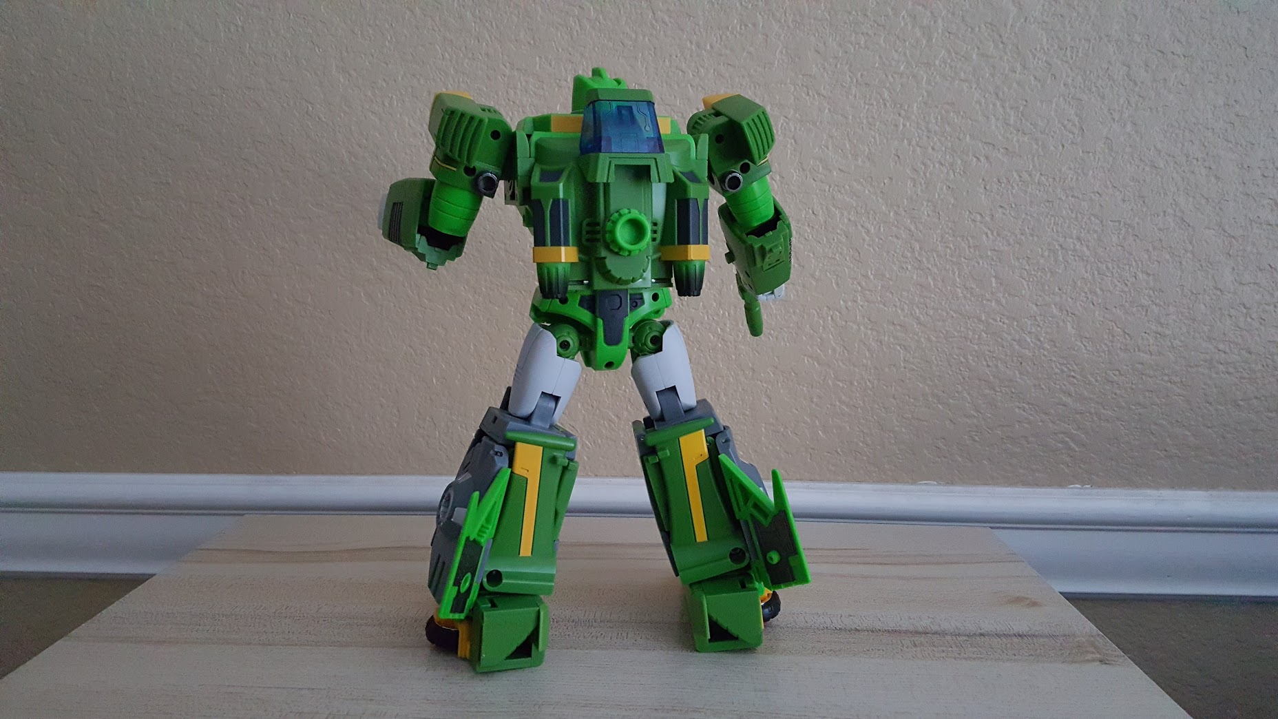 I am very happy with Gundog. I opted for the cartoon accurate green version (over the toy accurate dark green version). He comes packed in robot mode. The details in the head mold is excellent, and the design is unmistakably Hound. He’s got enough articulation to satisfy those fans who like dynamic poses in their figures. I do have two small gripes about the robot mode. The legs can appear a bit thick. And the upper portion of the figure does not appear to be able to snap in with the lower half, resulting in a figure that like to bend forward at the waist when it’s being handled.